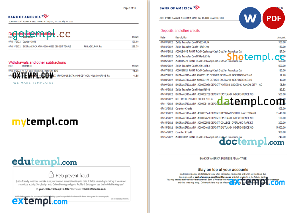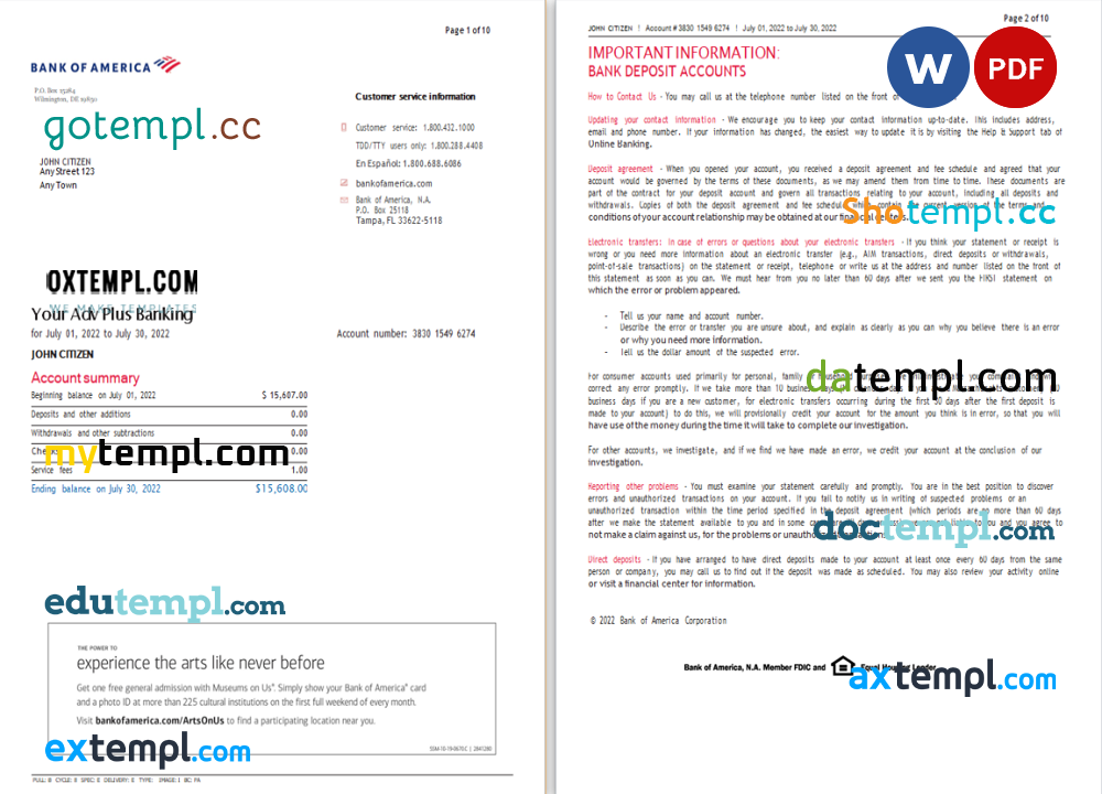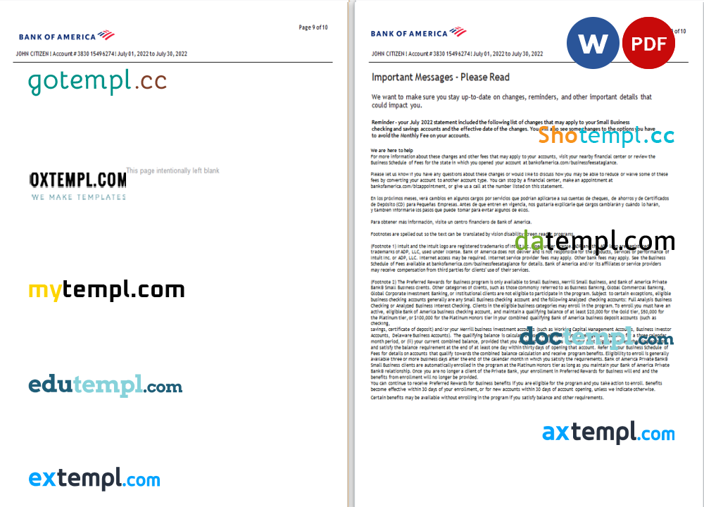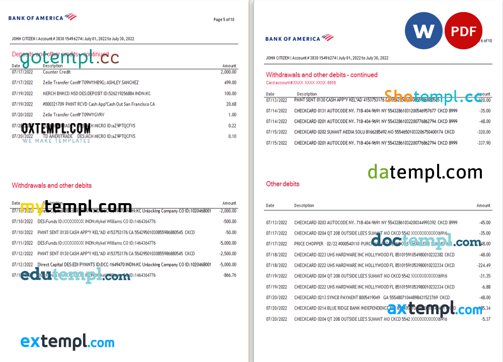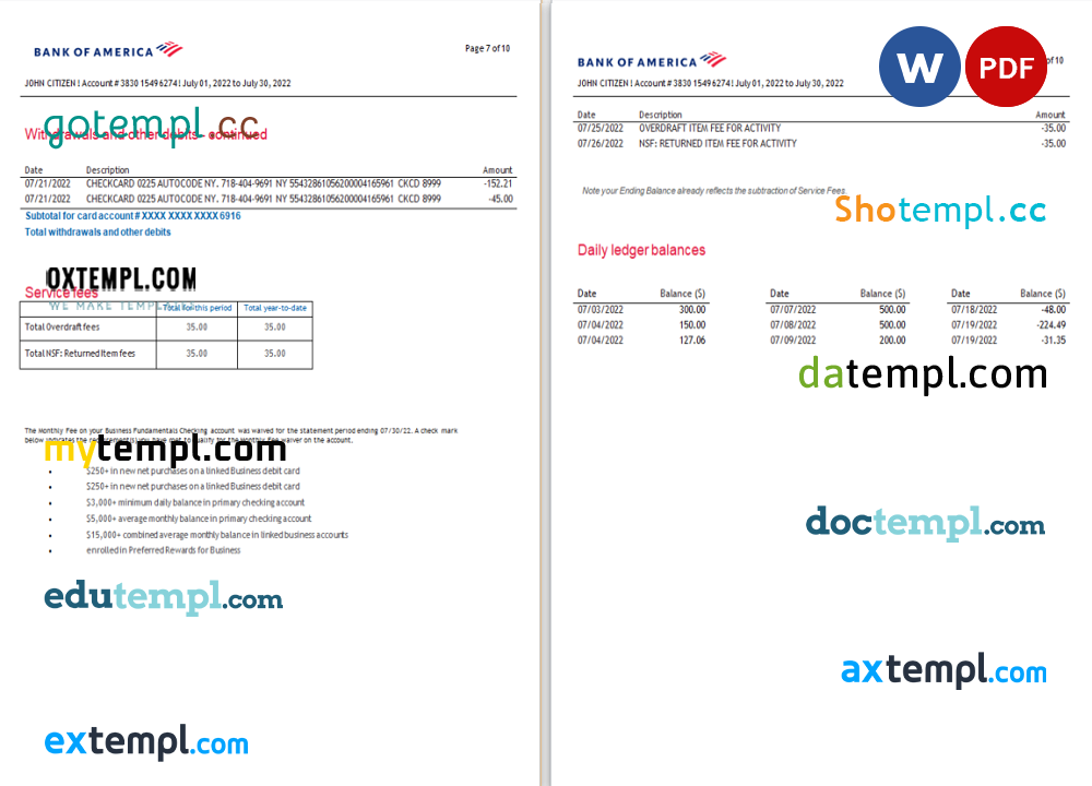 Completely editable USA Bank of America bank statement 3 – 6 months example in .doc format.