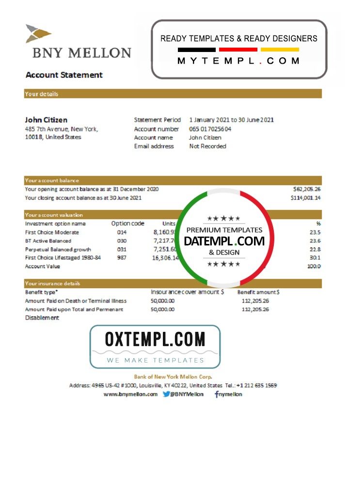 USA Bank of New York Mellon bank statement 3 – 6 months example of high quality, which may be used as a proof of address in many sites.