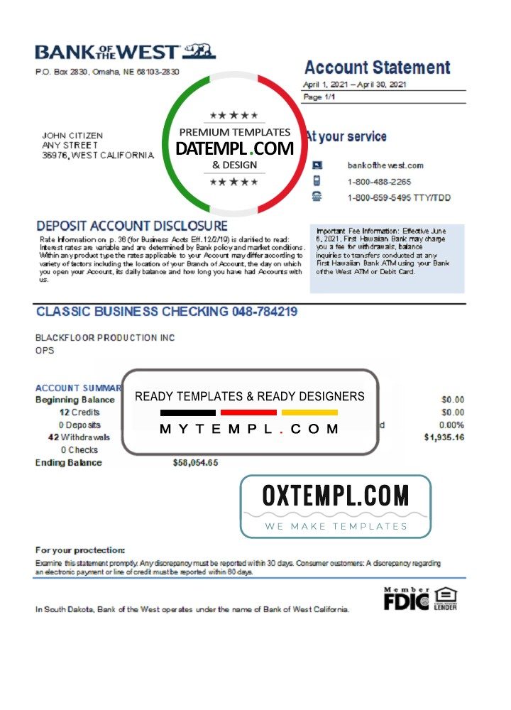 USA Bank of the West bank statement example of high quality, which may be used as a proof of address in many sites.