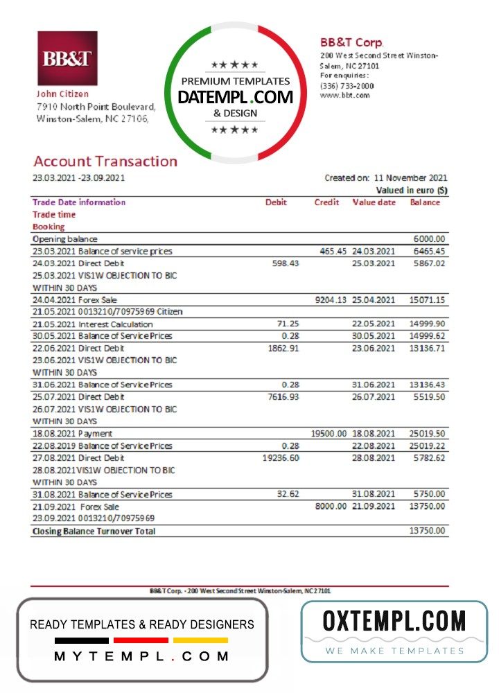 USA BB&T Corp. bank statement 3 – 6 months easy to fill example in .xls and .pdf file format