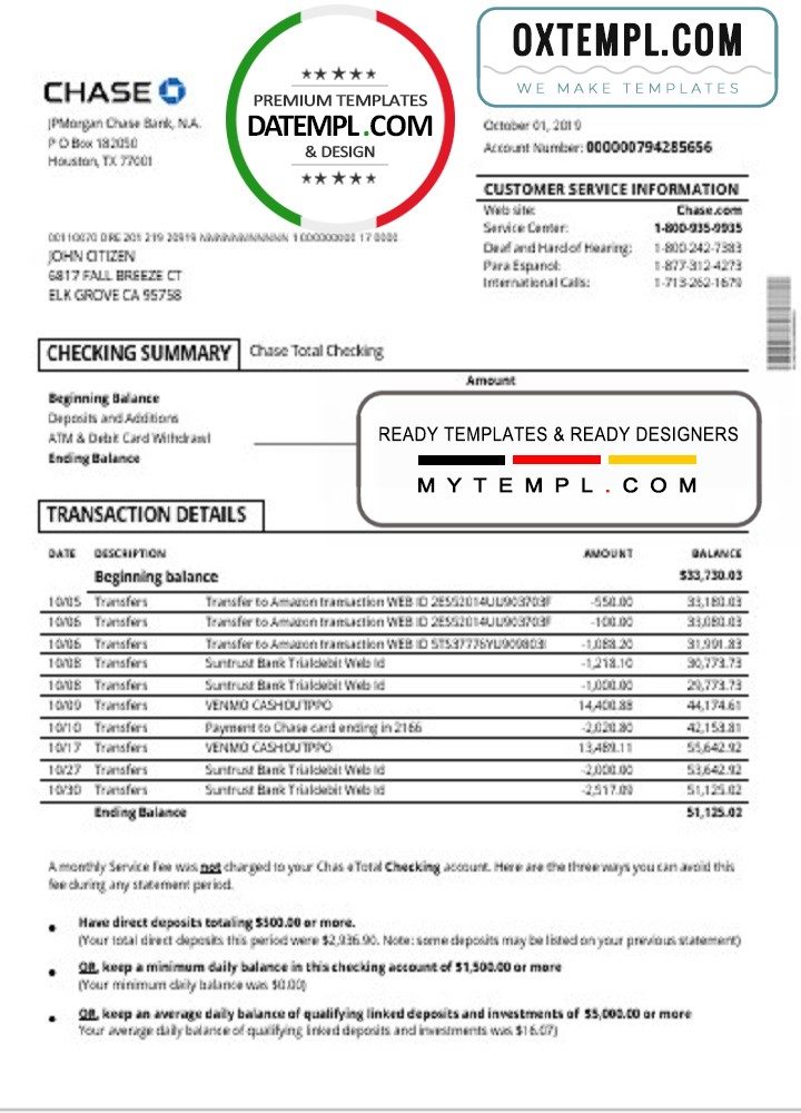 Like all our documents, the USA Chase account statement is of high quality. The examples helps you to prove your address where an address verification is required.
