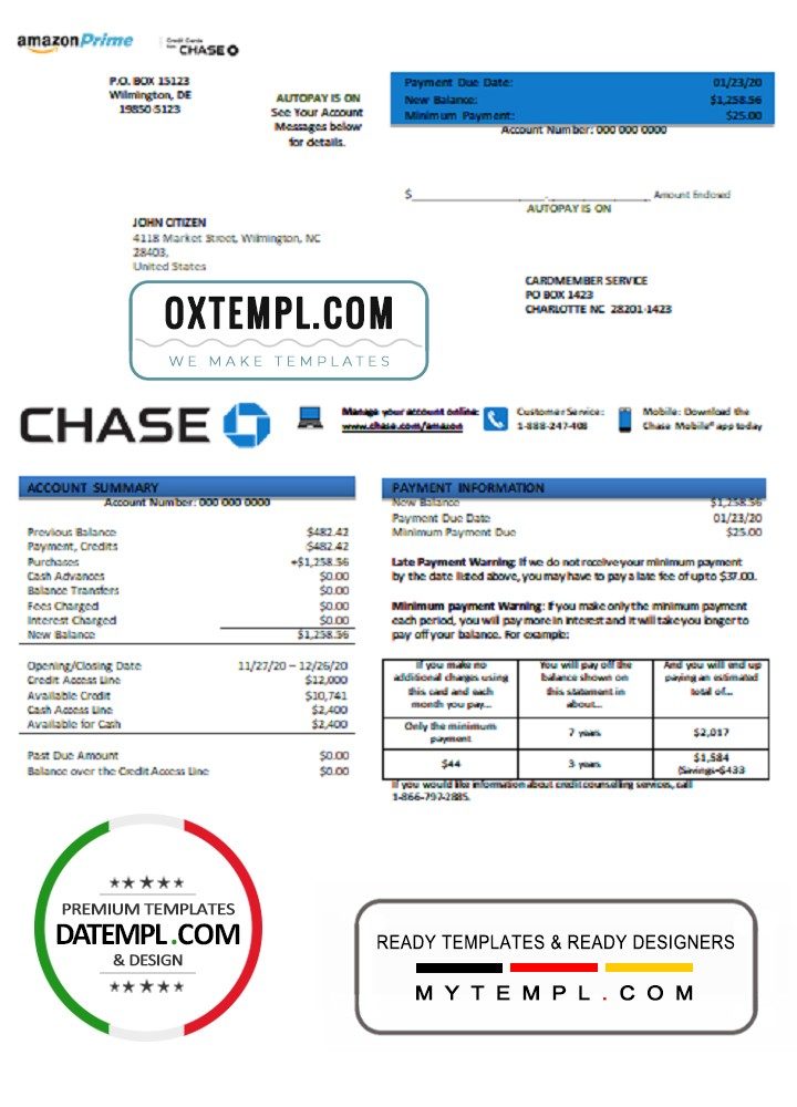 Like all our documents, this American Chase bank credit card statement example is of high quality, which may be used as a proof of address in many sites.