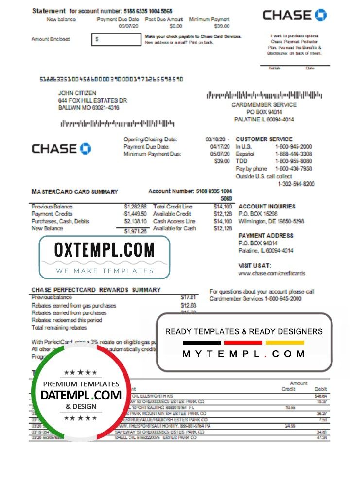 Completely editable American Chase bank credit card statement of high quality, which may be used as a proof of address in many sites.