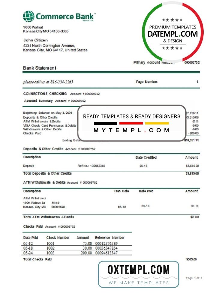 Completely editable USA Commerce bank statement 3 – 6 months of high quality, which may be used as a proof of address in many sites.
