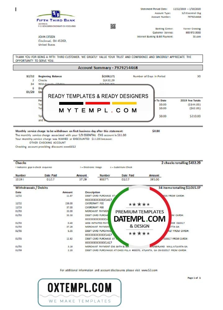 Completely editable Fifth Third bank statement of high quality, which is a proof of the available balance from the bank.
