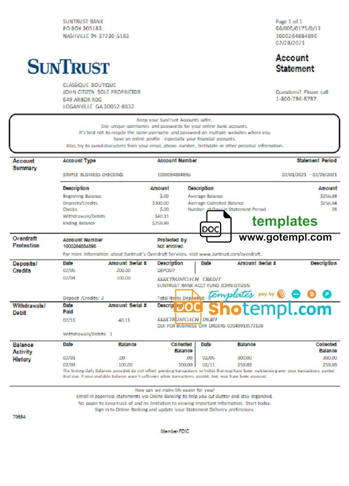 Completely editable USA Georgian SunTrust bank statement 3 – 6 months of high quality, which may be used as a proof of address in many sites.
