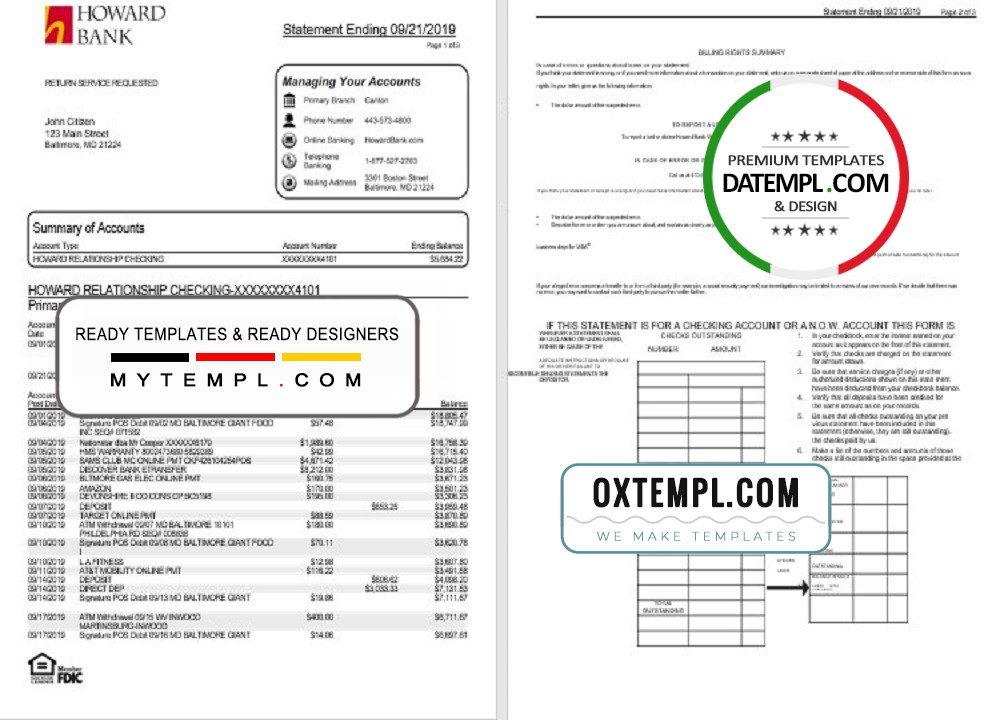 USA Maryland Howard Personal proof of address bank statement 3 – 6 months example in Word and PDF format (4 pages)