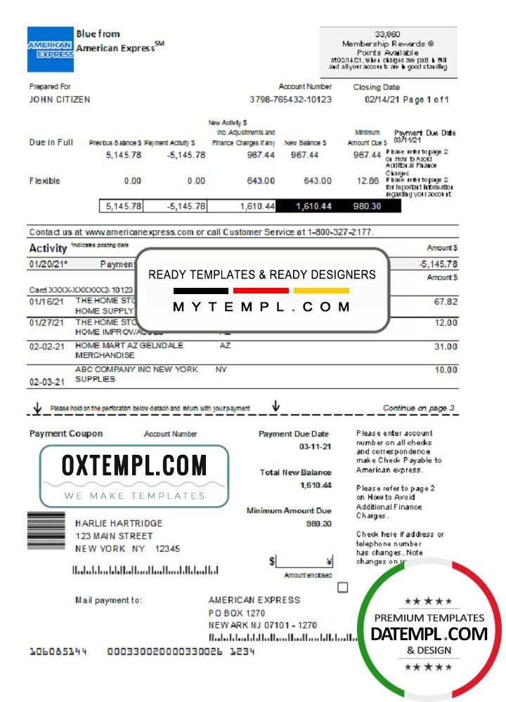 USA New York American Express Blue bank statement 3 – 6 months example of high quality, which may be used as a proof of address in many sites.