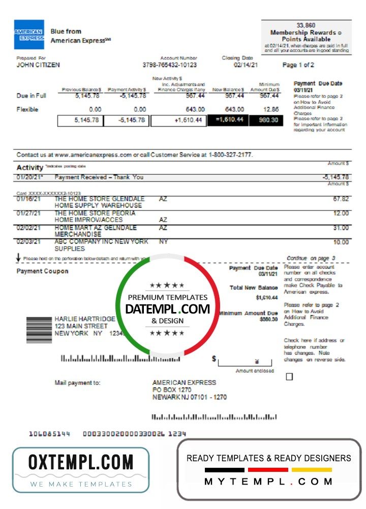 Fully editable USA New York American Express Blue bank statement 3 – 6 months in Word and PDF format example in doc format. High-quality easy fillable example.